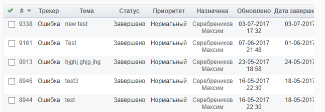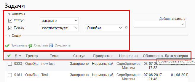 Нажимаем на название трекера, чтобы просмотреть задачи подробнее. При нажатии на Просмотреть все задачи откроется список со всеми обращениями: и ошибками, и улучшениями, и поддержкой. По умолчанию отображаются только открытые обращения. Для просмотра старых обращений, например, нужно в Фильтрах выставить Статус закрыто. После выбора фильтров для обновления списка задач нажимаем кнопку Применить.