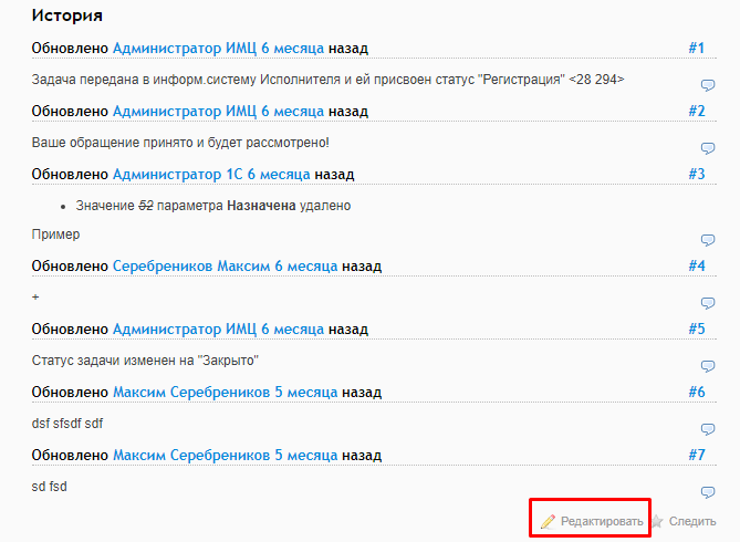 Ниже расположена история изменений. Она отображает все действия, которые происходили с задачей с момента создания. При необходимости можно добавить к задаче комментарий, нажав кнопку Редактировать.