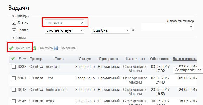 При помощи фильтров выбираем статус Закрыто и нажимаем Применить.