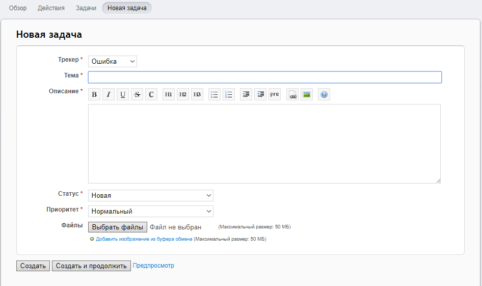 В поле Тема кратко указываем суть вопроса. В поле Описание рассказываем о проблеме подробнее, в деталях. Статус оставляем Новая. Приоритет выбираем тот, который максимально подходит к вашей задаче. Если решение необходимо как можно скорее – выбираем Срочный.