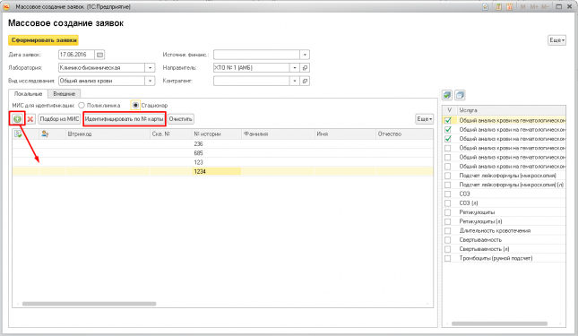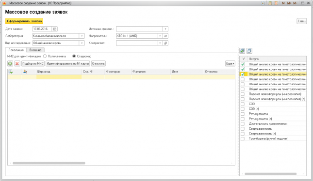 1. Добавление необходимого количества заявок и идентификация пациентов. Заявки делятся на локальные и внешние. Локальные пациенты идентифицируются по МИС, внешние по ТФОМС.