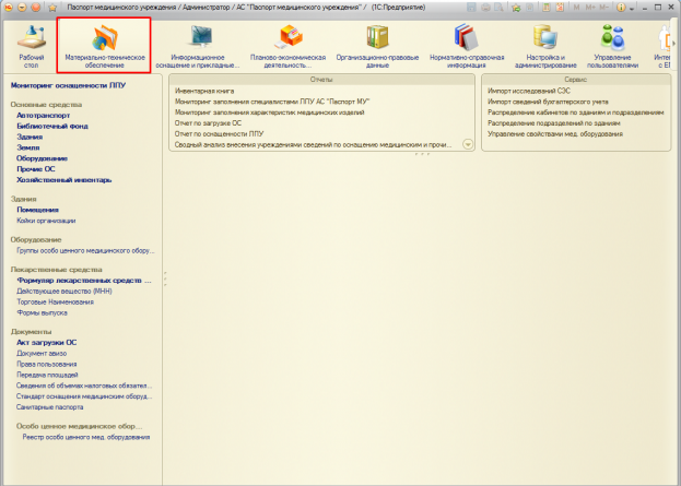Функциональная возможность «Материально-техническое обеспечение» позволяет организовать управление свойствами и характеристиками имущества медицинских организаций.