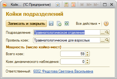 Числовой реквизит «Количество коек» заполняется в пользовательском режиме. Указывается профиль койки (взрослый или детский) и количество коек.