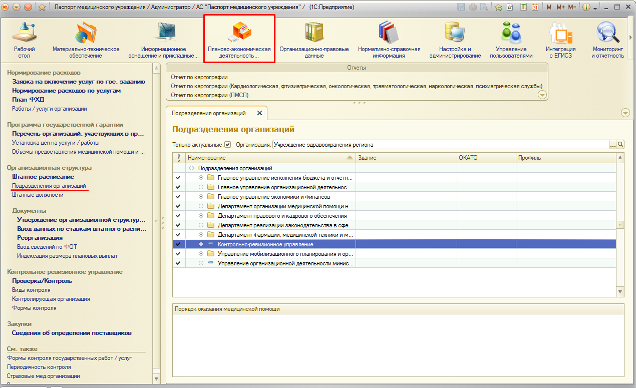 Справочник «Подразделения организации» расположен в подсистеме «Планово-экономическая деятельность» в разделе «Организационная структура».