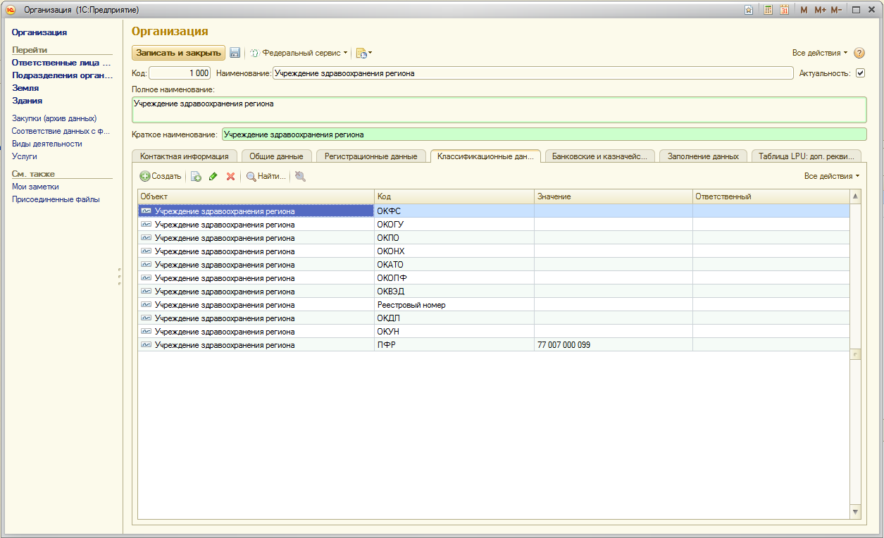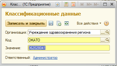 При работе с классификационными данными организации в поле «Значение кода» вносятся значения кода учреждения в соответствии с Общероссийскими классификаторами.