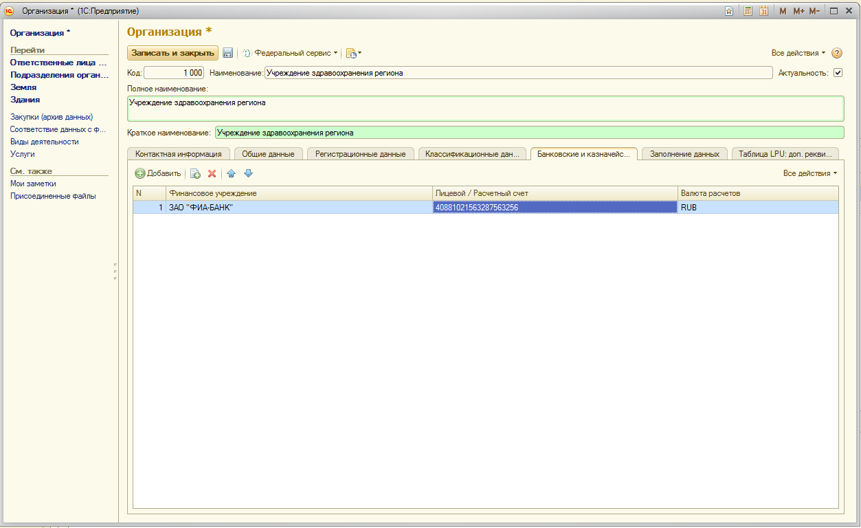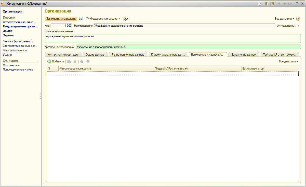 На вкладке «Банковские реквизиты» с помощью кнопки «Добавить» выбирается из справочника финансовую организацию, где открыт расчетный/лицевой счет ЛПУ: Банк/Казначейство. Справочник «Банк» содержит в себе перечень банковских организаций по Российской Федерации.