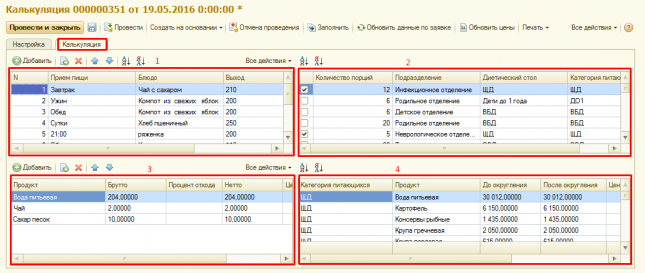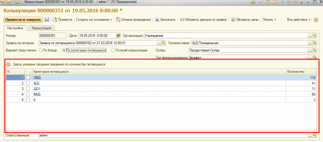 После этого система рассчитает необходимое количество продуктов питания по указанной заявке. Так же на форме будут представлены сводные сведения по количеству питающихся.