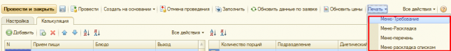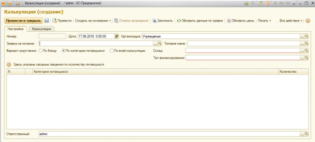 Заполняются обязательные поля (если документ создается на основании «Заявка по питающимся», то поля заполняются на основании этого документа, за исключением поля «Типовое меню»):