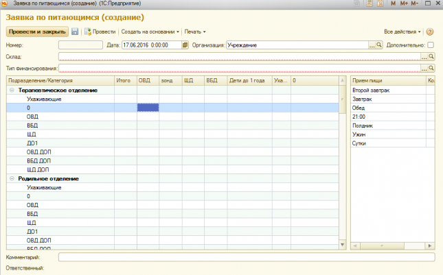 Далее следует указать количества питающихся в разрезе диетического стола и категории питающегося, привязанного к подразделению